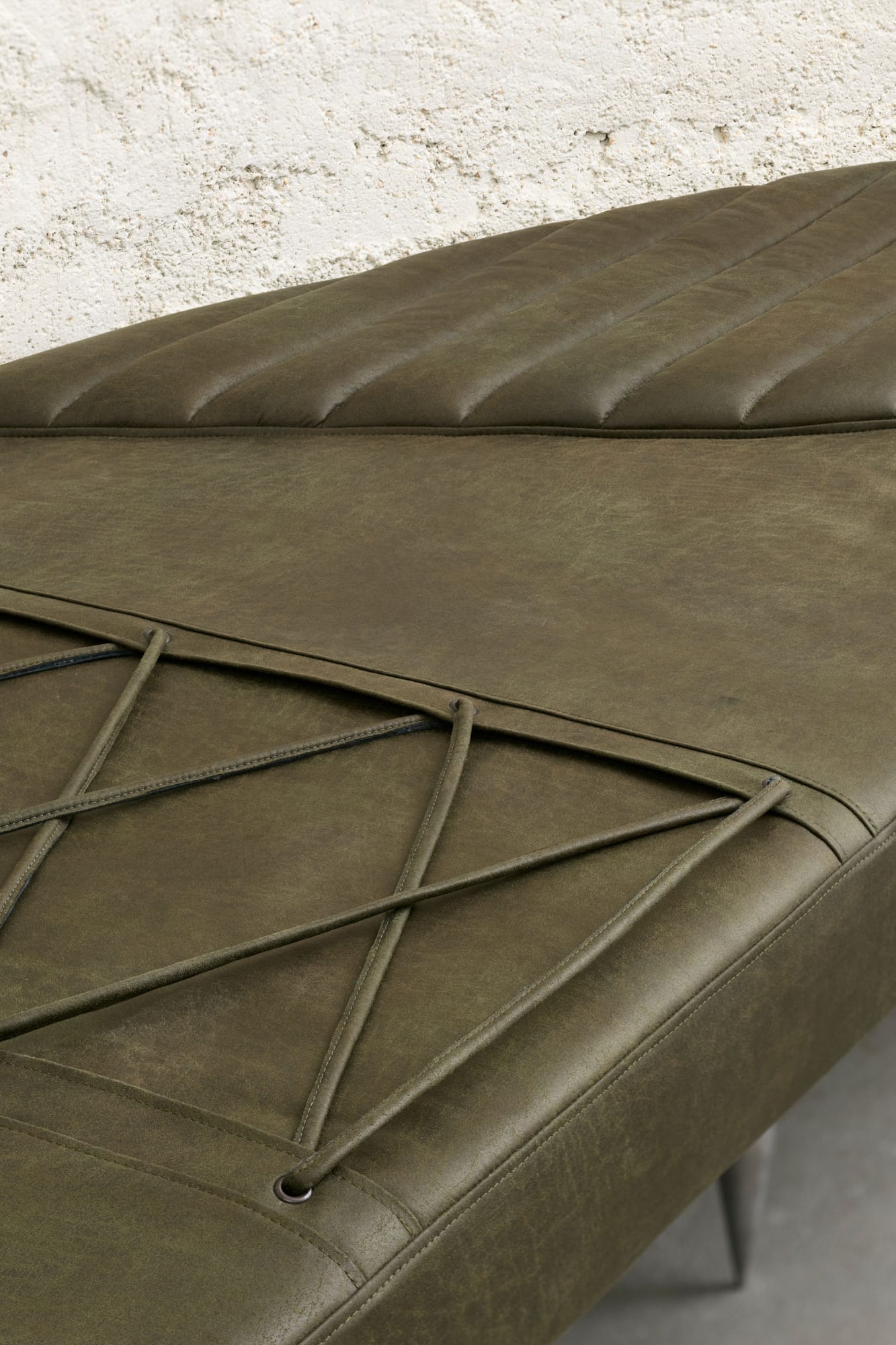 KLÁRA HOSNEDLOVÁUntitled (from the series Nest), 2020stainless steel, upcylcled leather, polyestersitting area: 392.5 x 91 x 14cmfurniture base: 40 cm, 4 cm diameterheight: 58 cm